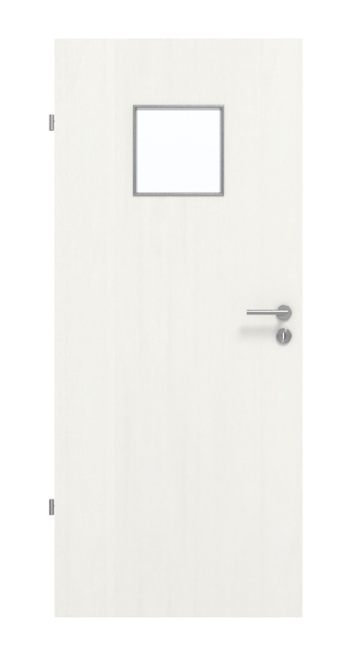 W centrum strukturyzowanej konstrukcji drzwi znajduje się niewielkie, kwadratowe wycięcie na szybę. Wzór Authentic Bianco lśni w przyjemnej bieli. Wytrzymała okładzina HPL jest odporna na zarysowania, uderzenia i ścieranie oraz łatwa w czyszczeniu.
