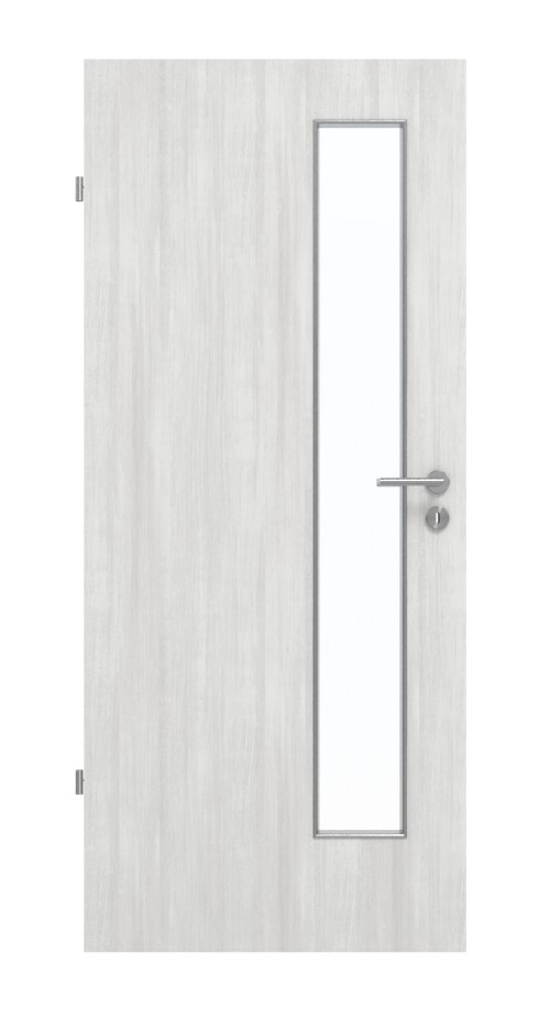 Skrzydło drzwiowe ma po stronie zamka niemal 20 cm szeroki otwór świetlny, który nadaje nowoczesny akcent. Jasny odcień szarości z delikatnymi cieniami rozciąga się od góry do dołu skrzydła drzwiowego. Wytrzymały materiał HPL jest odporny na zarysowania, uderzenia i ścieranie oraz łatwy do czyszczenia.