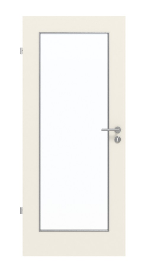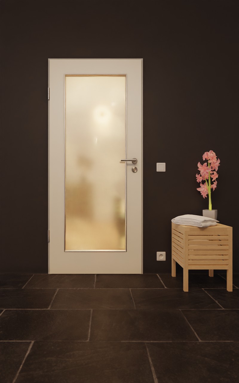 Drzwi dekoracyjne przekonują solidną powierzchnią HPL i prostym wycięciem szklanym: