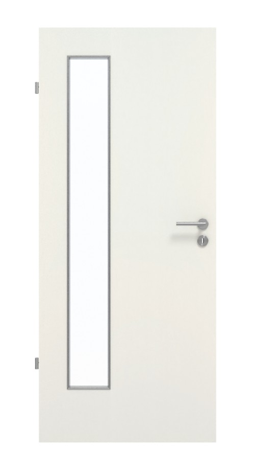 Podłużny, wąski wycięty otwór na stronę zawiasową drzwi nadaje im nowoczesny charakter. Neutralna biel nadaje wystrojowi świeżości. Towarzyszy temu delikatna struktura. Wytrzymała okładzina HPL jest odporna na zarysowania, uderzenia i ścieranie oraz łatwa w czyszczeniu.
