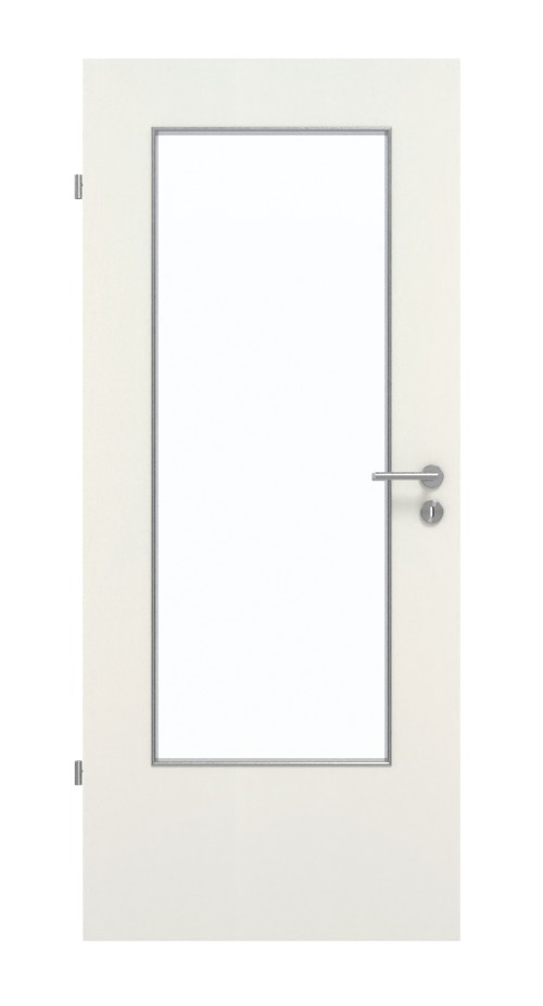 Duże, prostokątne wycięcie na szybę zapewnia dodatkowe oświetlenie pomieszczenia. Harmonijny wygląd drzwi zapewnia dekor w kolorze białym z fakturą. Wytrzymała powłoka HPL jest szczególnie odporna na zarysowania i ścieranie oraz na dostępne w handlu środki czyszczące.