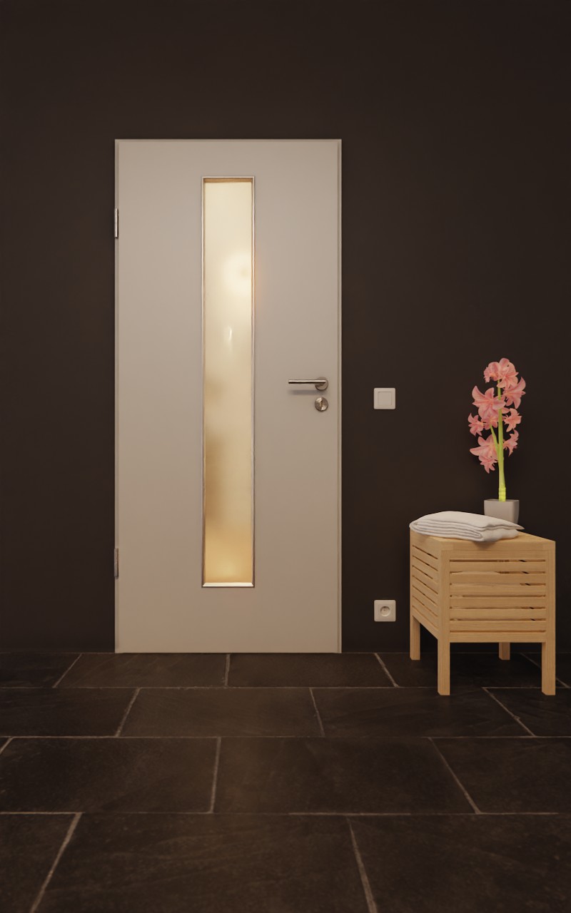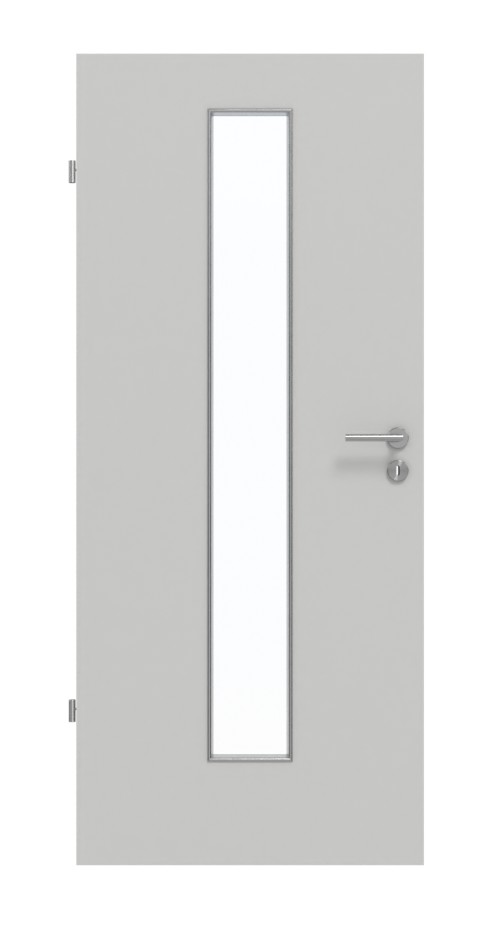 Drzwi funkcjonalne od Garant zachwycają powierzchnią HPL w kolorze D92-60 Dove Grey oraz prostokątnym wycięciem szklanym: