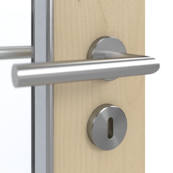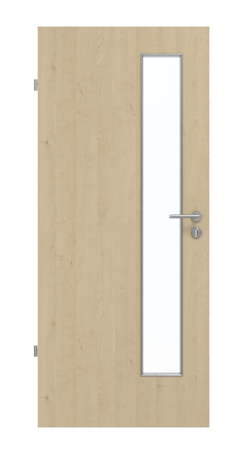 Obok klamki biegnie długie, wąskie przeszklenie nad skrzydłem drzwiowym. Dzięki jasnym odcieniom drewna dekor Natura Ahorn tworzy spokojną atmosferę. Wytrzymała warstwa HPL jest odporna na ścieranie, uderzenia i zarysowania oraz wyjątkowo odporna na działanie światła.