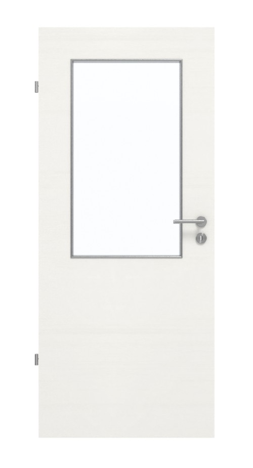 W górnej części drzwi znajduje się prostokątne wycięcie na szybę, które zapewnia piękny dopływ światła. Delikatne usłojenie przebiega w poprzek przez biały dekor. Wytrzymała powłoka HPL jest szczególnie odporna na zarysowania i ścieranie oraz na dostępne w handlu środki czyszczące.