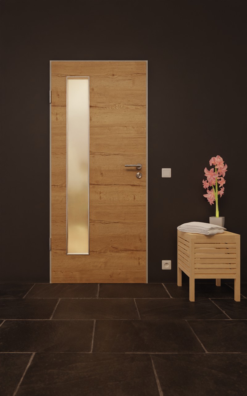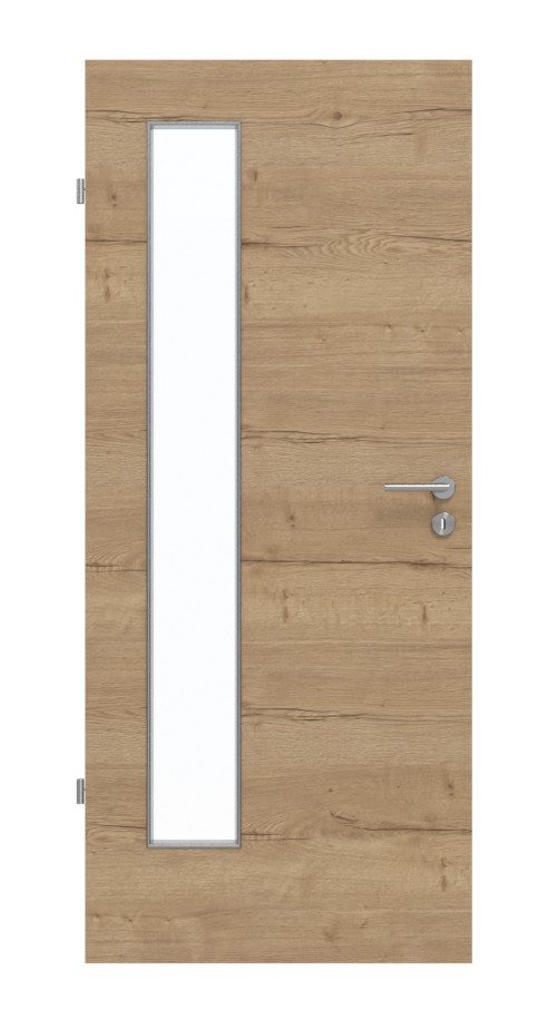 Wąskie przeszklenie po stronie zawiasów nadaje modelowi nowoczesny wygląd. Na poziomym dekorze drewna Quer Authentic Risseiche widoczne są ciemne usłojenia i delikatne sęki. Wytrzymała i odporna na światło warstwa wierzchnia HPL jest odporna na zarysowania i ścieranie i została zaprojektowana z myślą o codziennym intensywnym użytkowaniu.