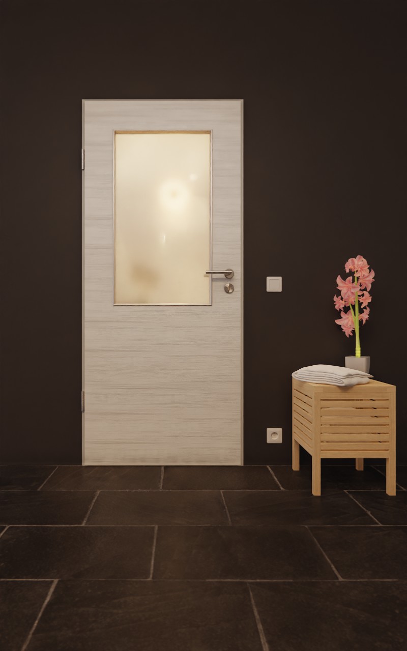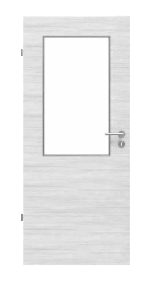 W górnej części drzwi znajduje się szerokie przeszklenie, które stanowi nowoczesny element wystroju. Spokojne, jasnoszare usłojenie przebiega w poprzek dekoru Authentic Grigio. Wytrzymała powłoka HPL jest szczególnie odporna na zarysowania i ścieranie oraz na dostępne w handlu środki czyszczące.