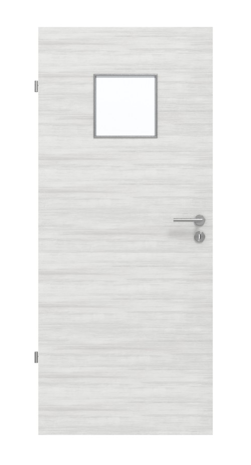 Kwadratowe wycięcie na szybę na wysokości oczu nadaje skrzydłu drzwiowemu indywidualny wygląd. Spokojne usłojenia w kierunku poprzecznym charakteryzują nowoczesny wygląd tego dekoru Authentic Grigio. Zarysowania, ścieranie i uderzenia nie mają wpływu na niezwykle wytrzymałą powierzchnię HPL, odporną na działanie popularnych środków czyszczących.