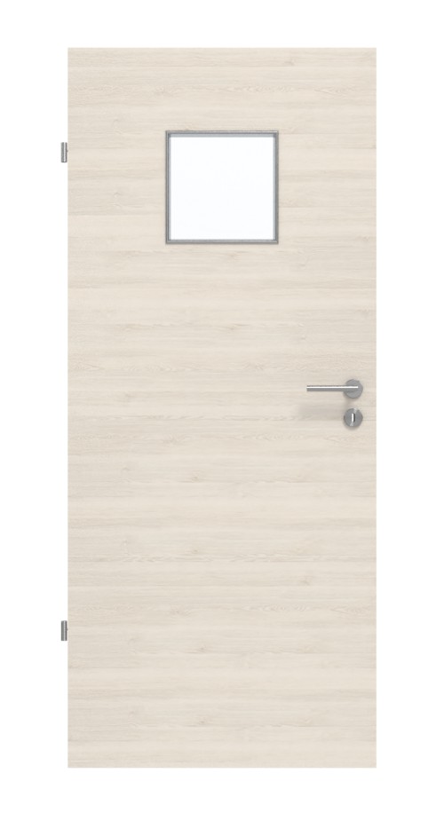 W górnej części skrzydła drzwiowego znajduje się niewielkie, kwadratowe wycięcie na szybę. Słoje drewna delikatnie wyróżniają się na jasnym dekorze Quer Authentic Perl. Ich poziome ułożenie podkreśla nowoczesne, świeże wykończenie wizualne. Zarysowania, ścieranie i uderzenia nie mają wpływu na niezwykle wytrzymałą powierzchnię HPL, odporną na działanie popularnych środków czyszczących.