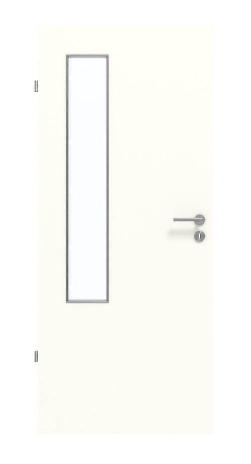 Drzwi do pomieszczeń wilgotnych zachwycają solidną powierzchnią HPL i prostym wycięciem szklanym: