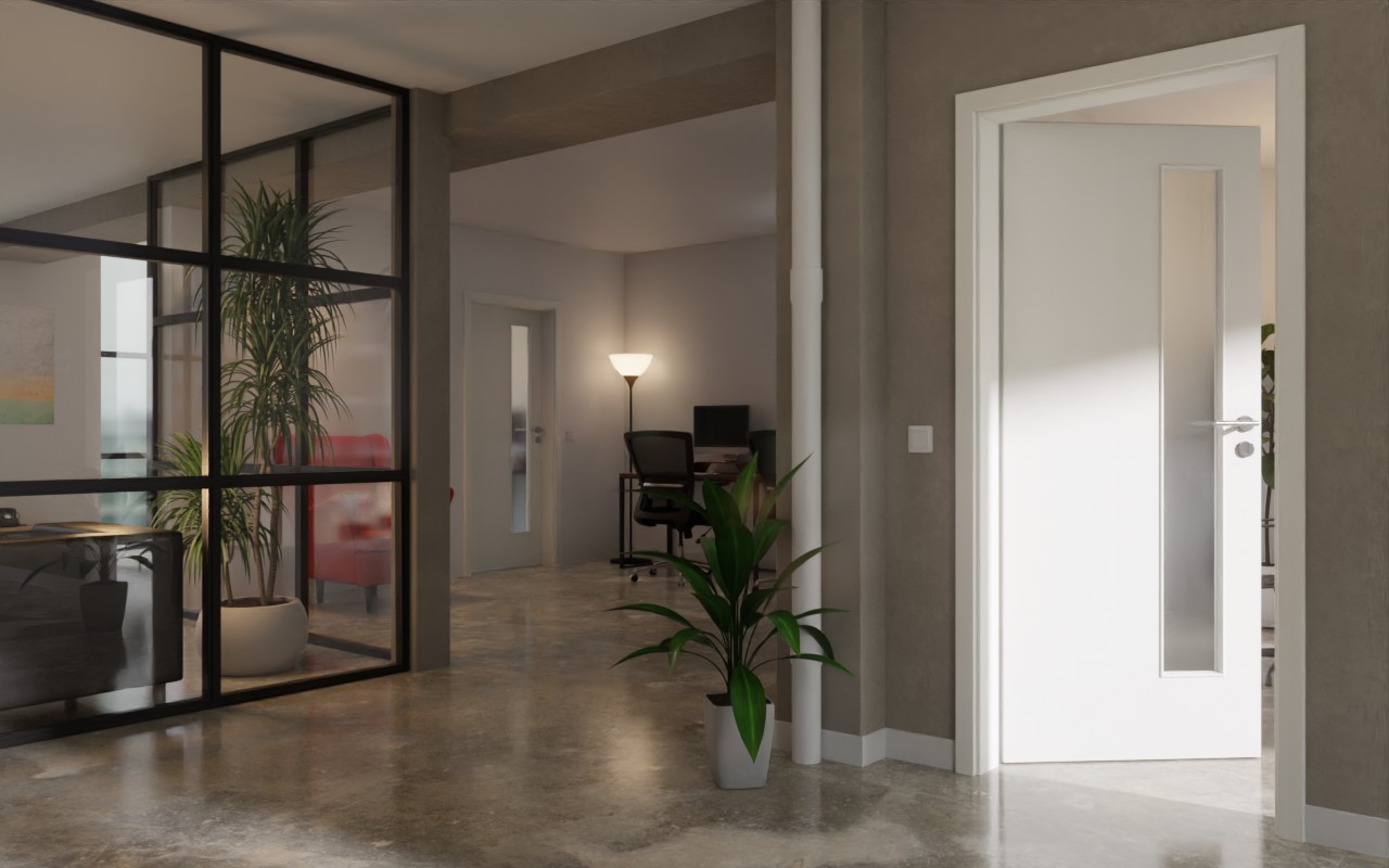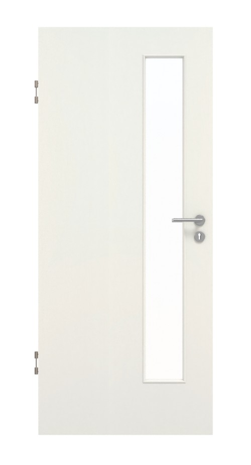 Zaletą, szczególnie w przypadku ciemnych pomieszczeń, jest wąskie przeszklenie, które przepuszcza dodatkowe światło. Delikatna faktura na białym skrzydle drzwi nadaje temu modelowi przyjemną w dotyku powierzchnię. Ponadto ten nadający się do codziennego użytku laminat HPL charakteryzuje się wysoką odpornością na ścieranie .
