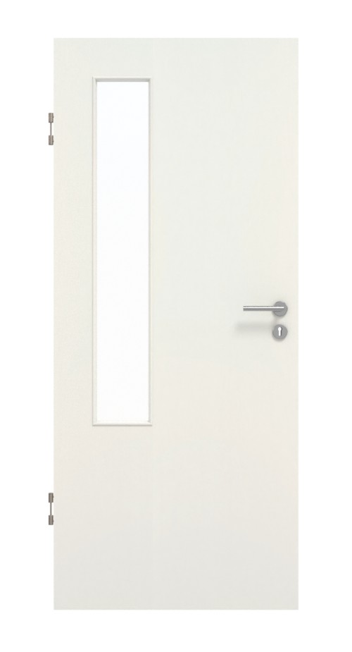 Dzięki krótkiemu przeszkleniu po stronie zawiasów model ten nadaje modny akcent. Podczas gdy biały odcień nadaje skrzydłu drzwiowemu nowoczesny wygląd, jego faktura zapewnia przyjemny dotyk. Wytrzymała płyta laminowana HPL doskonale radzi sobie z zarysowaniami i ścieraniem. Ponadto łatwo się go czyści.