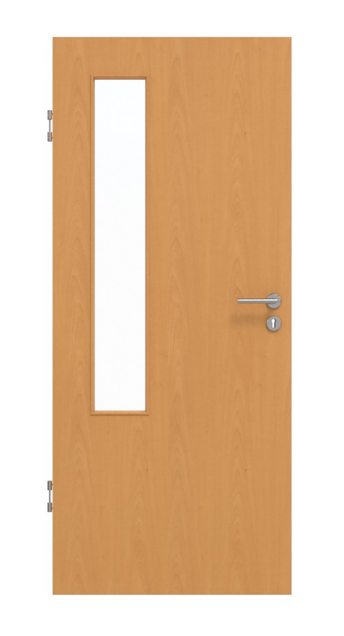 W górnej części skrzydła drzwiowego, od strony zawiasów, znajduje się wąski otwór okienny. Delikatny wzór słojów podkreśla przytulny charakter dekoracji drewnianej Buk Ekskluzywny, utrzymanej w brązowej tonacji. Powierzchnia HPL wyróżnia się ponadto wysoką odpornością na ścieranie oraz łatwością w pielęgnacji.