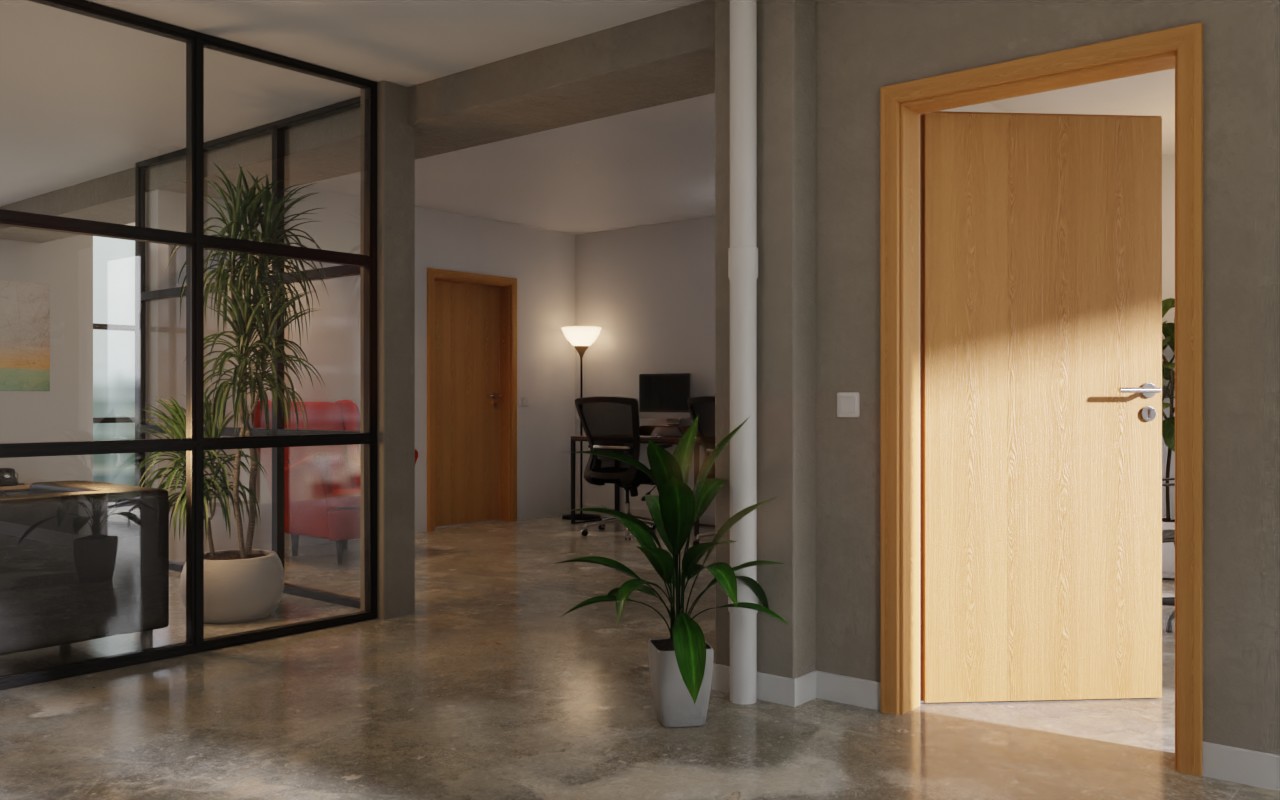 • Wytrzymałe drzwi wewnętrzne do obiektu w kolorze dąb Premium
