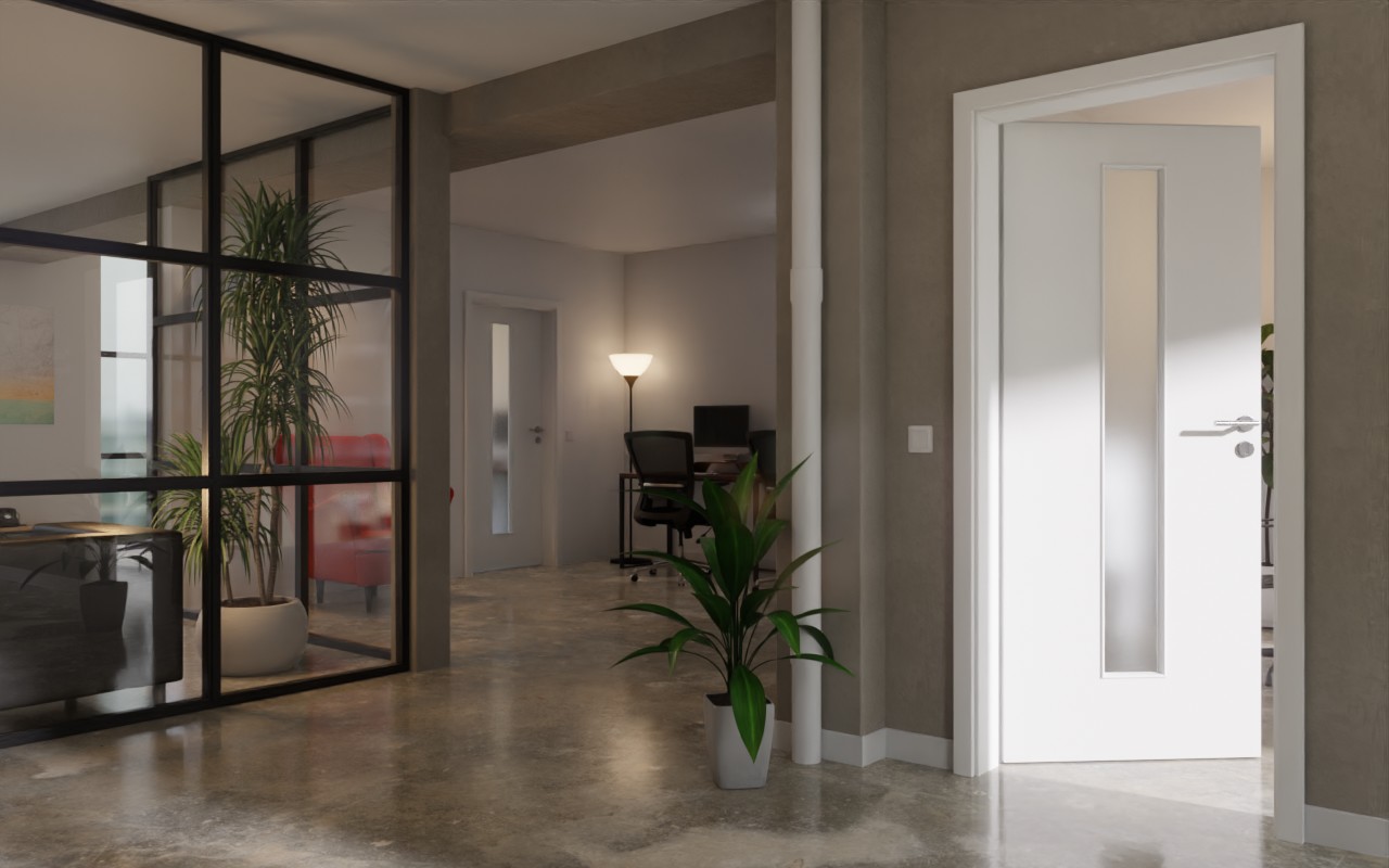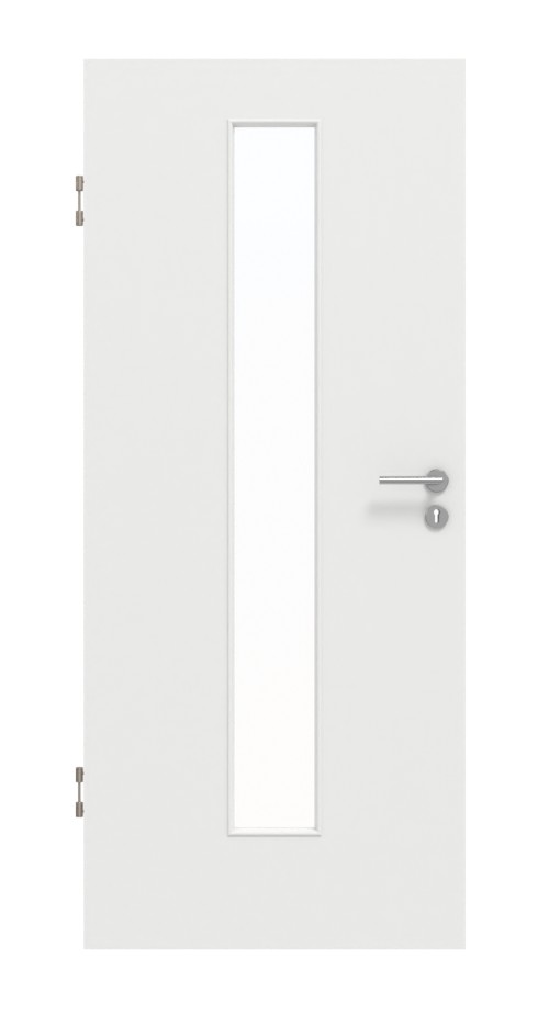 Idealna równowaga między estetycznym przeszkleniem a wytrzymałością: Dzięki drzwiom wewnętrznym do obiektu z LA-4 na środku w matowym białym lakierze 9016 firmy Garant zadbasz o wysoką funkcjonalność w swoim domu.