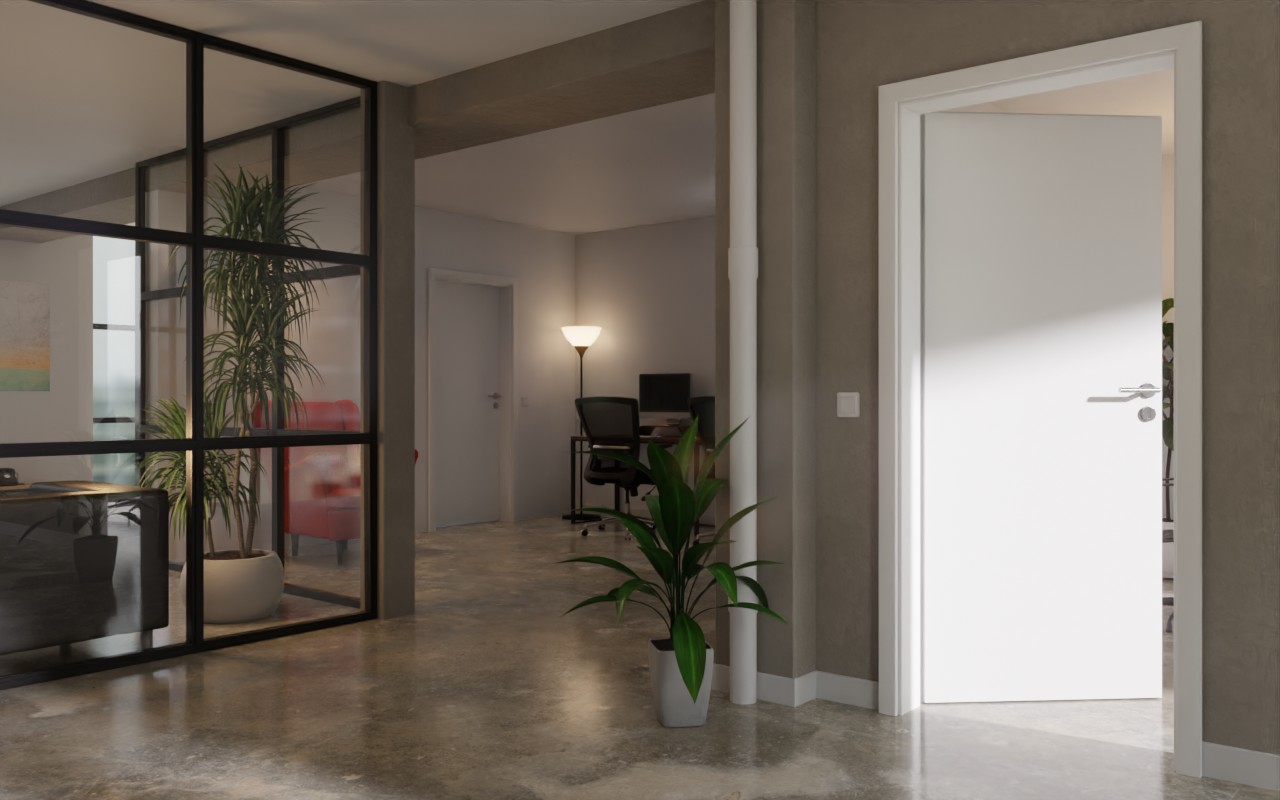 Stylowa wytrzymałość: Drzwi wewnętrzne do obiektu w matowym białym lakierze 9016 firmy Garant przekonują swoją wytrzymałością.