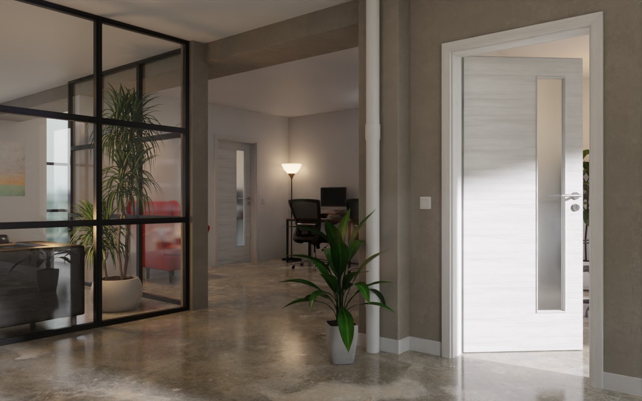 Idealna równowaga między estetycznym przeszkleniem a wytrzymałością: Drzwi wewnętrzne do obiektu LA-4 po stronie zamka o powierzchni Quer Authentic Grigio firmy Garant wniosą światło i efektywność.