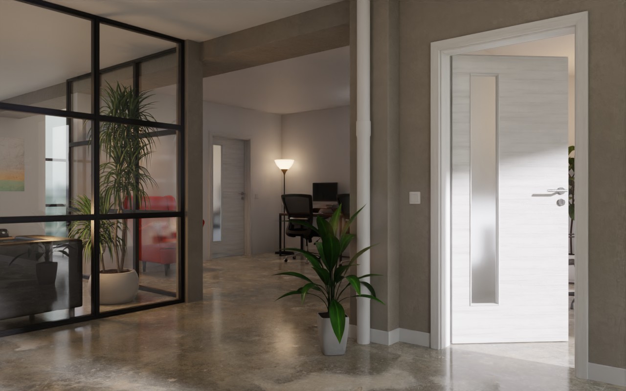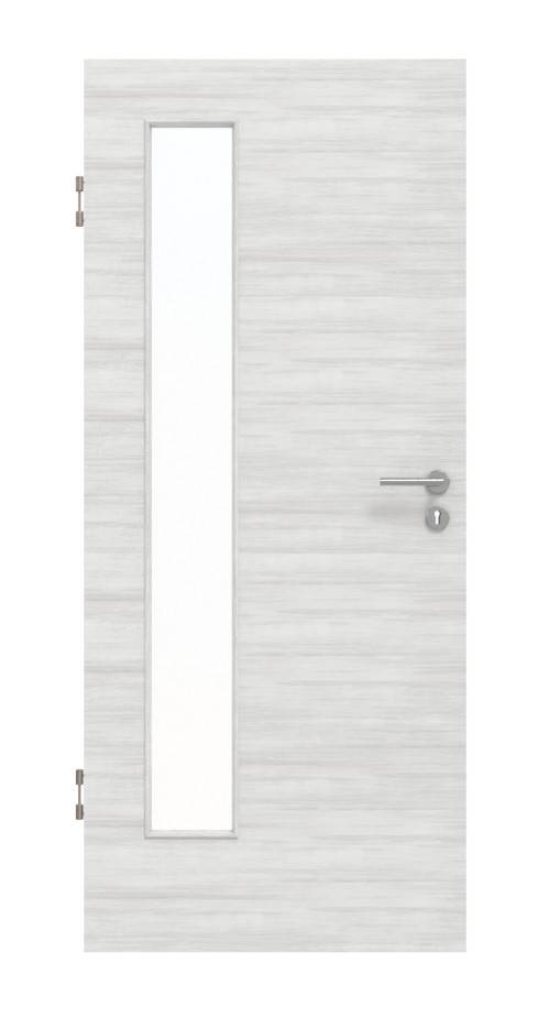 Na skrzydle drzwiowym po stronie zawiasów znajduje się wąskie przeszklenie. Drobne, poprzeczne linie wyróżniają się na dekorze Authentic Grigio Quer. Dzięki jasnoszaremu odcieniowi powierzchnia ta pasuje zarówno do nowoczesnych, jak i klasycznych wnętrz mieszkalnych. Laminat HPL jest odporny na duże obciążenia i łatwy w pielęgnacji.