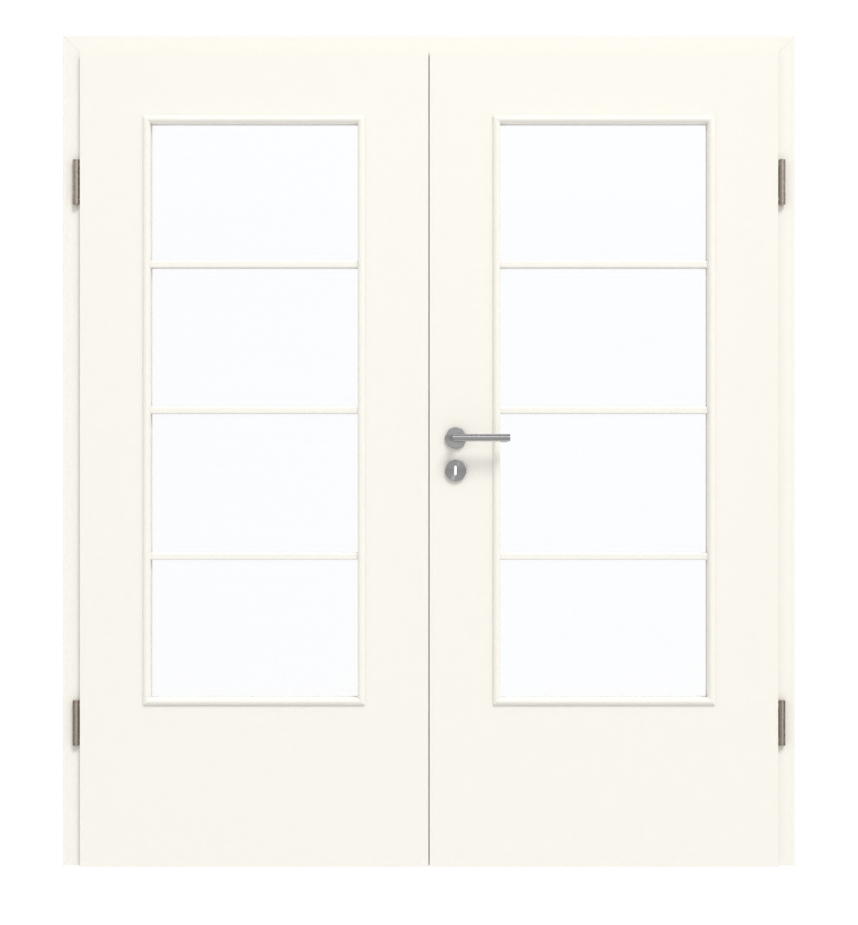 Trzy pionowe szprosy dzielą duże wycięcia na szybę na równe segmenty. Dzięki swojej powierzchni w kolorze bieli perłowej CPL skrzydło drzwiowe stanowi wzbogacenie każdego nowoczesnego wystroju wnętrza. Uderzenia lub zadrapania nie mają większego wpływu na wytrzymałą warstwę wierzchnią. Ponadto można ją łatwo wyczyścić.