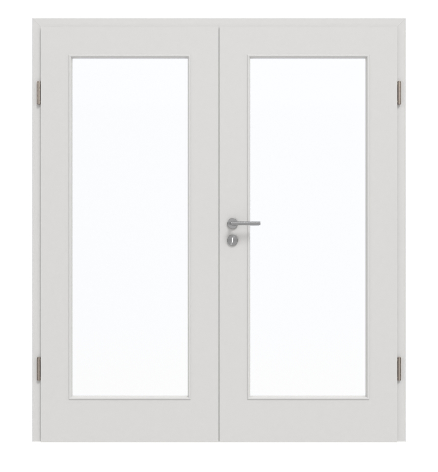 Środkowa część podwójnych drzwi wykonana jest z pełnej płyty wiórowej. Model ten może być stosowany zgodnie z grupą obciążenia M w pomieszczeniach prywatnych lub komercyjnych. W zestawie znajdują się skrzydło ruchome i skrzydło stałe, ościeżnica, zawiasy i zamek bębenkowy.