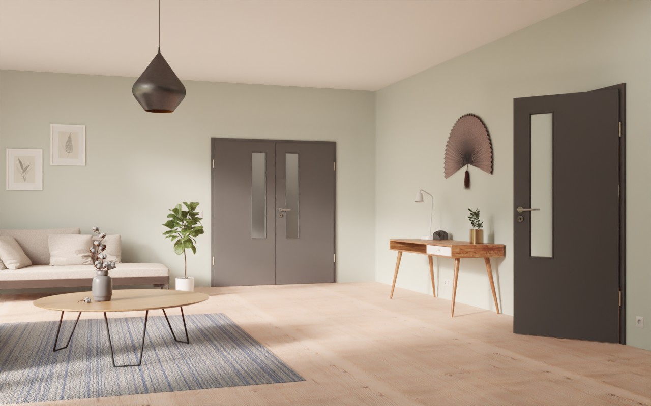 W górnej części skrzydeł drzwiowych po stronie zamka znajduje się wąskie przeszklenie. Powierzchnia CePaL Ebony nadaje skrzydłu drzwiowemu nowoczesną elegancję i jednolity antracytowy odcień. Ponadto laminat jest łatwy w pielęgnacji oraz odporny na zarysowania, uderzenia i ścieranie.