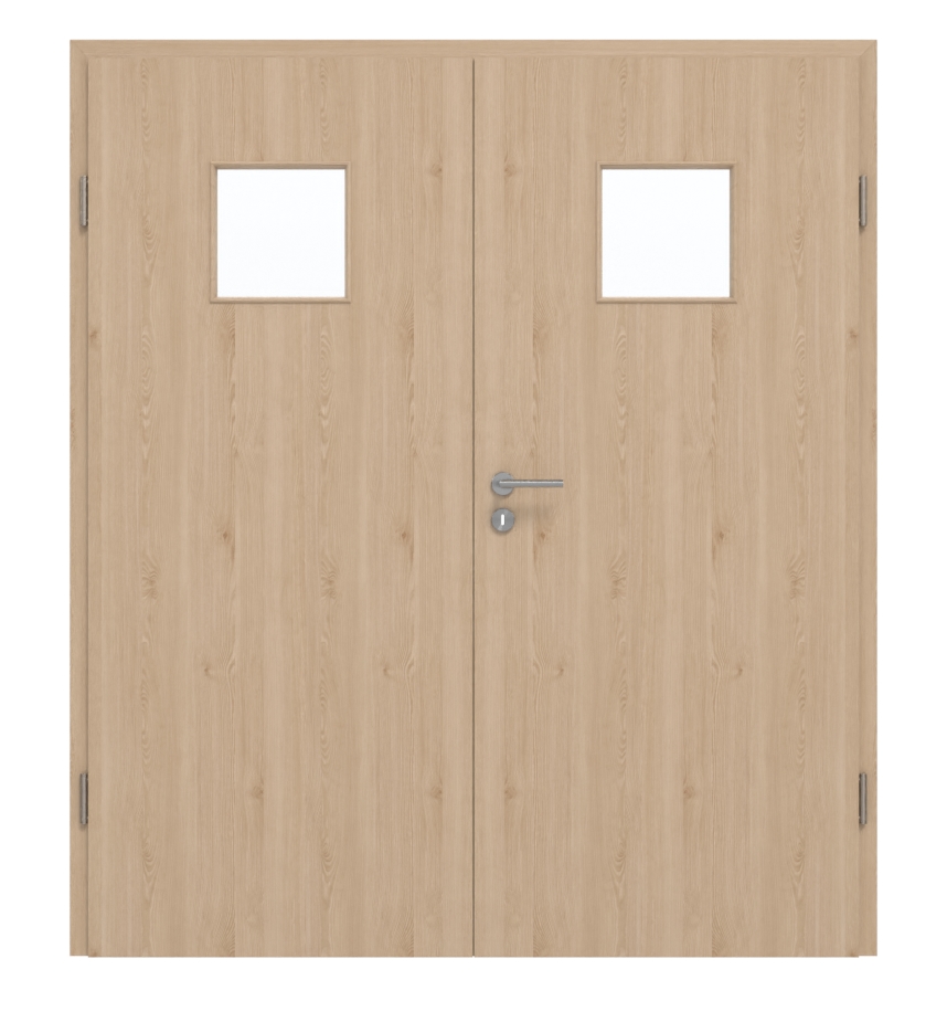 Rdzeń drzwi dwuskrzydłowych wykonany jest z płyty wiórowej. Zgodnie z klasą użytkowania M może być stosowany w pomieszczeniach prywatnych lub komercyjnych. W zestawie oprócz dwóch skrzydeł drzwiowych znajdują się również pasująca ościeżnica, zawiasy i zamek na klucz.