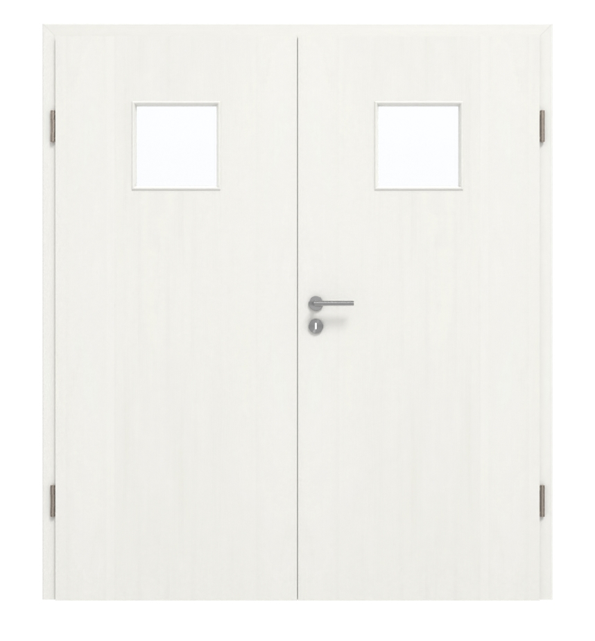 Kwadratowe wycięcie na szybę w górnej części wzbogaca nowoczesny design drzwi. Biały odcień i podłużne słoje drewna nadają skrzydłu drzwiowemu świeży i nowoczesny wygląd. Oprócz wykończenia wizualnego, warstwa wierzchnia charakteryzuje się wysoką wytrzymałością i łatwością pielęgnacji.