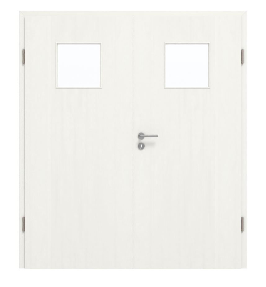 Środkowa część podwójnych drzwi wykonana jest z pełnej płyty wiórowej. Model ten może być stosowany zgodnie z grupą obciążenia M w pomieszczeniach prywatnych lub komercyjnych. Cena obejmuje skrzydło ruchome i stałe, ościeżnicę, zawiasy i zamek na klucz.