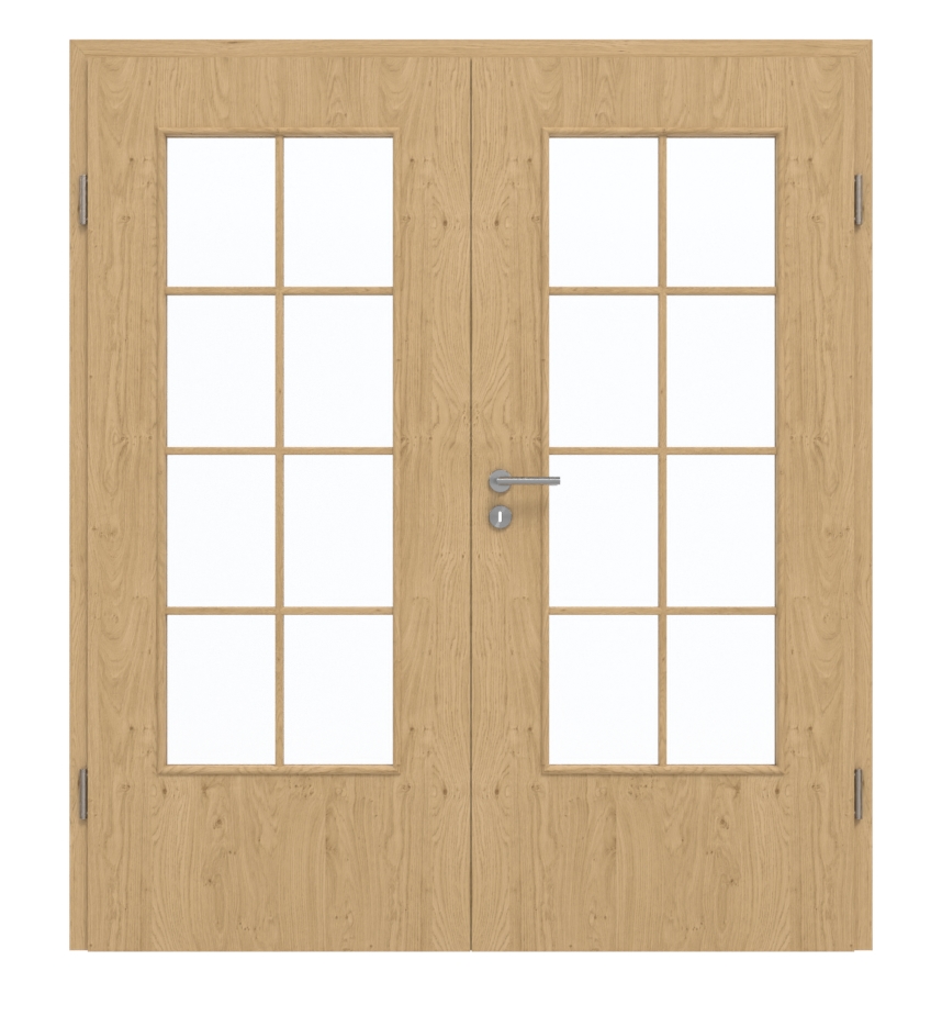 Duże przeszklenie w każdym skrzydle drzwiowym zapewnia światło w pomieszczeniu. Drobne szprosy dzielą szkło za optycznie na osiem równych prostokątów. Dekor Authentic Asteiche DA wiernie odwzorowujący prawdziwe drewno, zapewnia przytulną atmosferę w pomieszczeniach mieszkalnych. Oprócz atrakcyjnego wykończenia wizualnego, powłoka HPL przekonuje również swoją odpornością na zarysowania, uderzenia i ścieranie. Jest odporna na plamy i łatwa do czyszczenia.