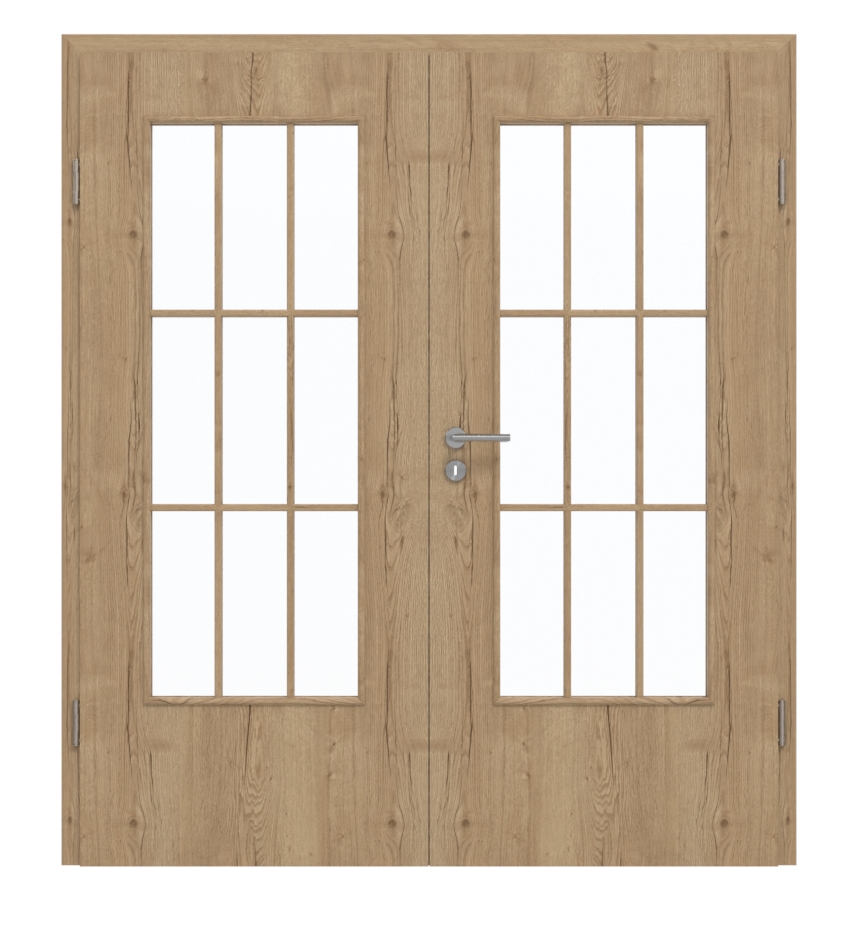 Prostokątny przeszklenie stanowi centrum designu skrzydła drzwiowego. Proste listwy dzielą je na dziewięć równych pól. Ciemne rysunki słojów drewna nadają dekorowi Authentic Risseiche DA rustykalny charakter. Dekoracyjna warstwa wierzchnia jest odporna na uszkodzenia oraz niewrażliwa na zarysowania i uderzenia.