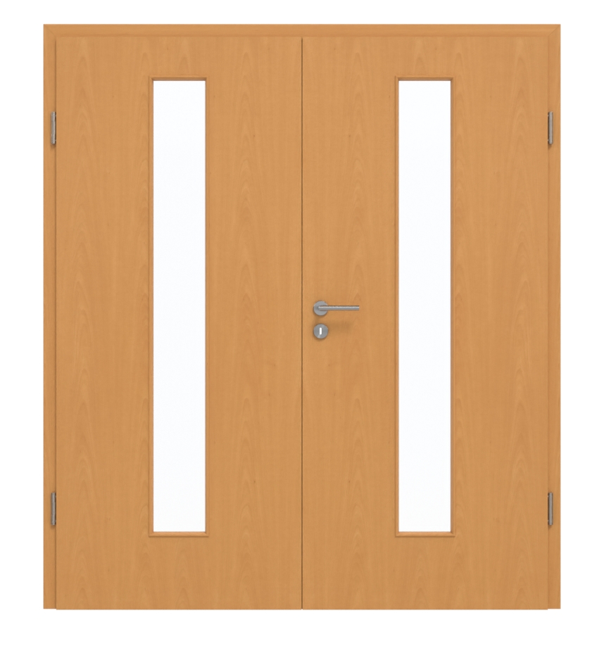 Podwójne drzwi nadają się zarówno do przestrzeni prywatnych, jak i biurowych. Dzięki rdzeniowi z pełnego wióru spełniają wymagania grupy obciążeniowej M. Oprócz skrzydeł drzwiowych w zestawie znajduje się również ościeżnica, zamek i zawiasy.