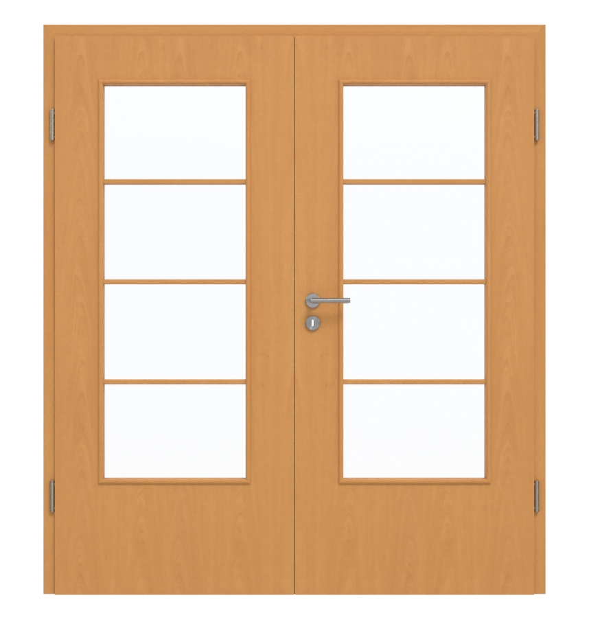 Rdzeń drzwi dwuskrzydłowych wykonany jest z płyty wiórowej. Produkt ten został przetestowany w klasie użytkowania M , dzięki czemu może być stosowany w pomieszczeniach prywatnych lub biurowych. Podana cena obejmuje oba skrzydła drzwi, odpowiednią ościeżnicę, zamek z kluczem oraz zawiasy.