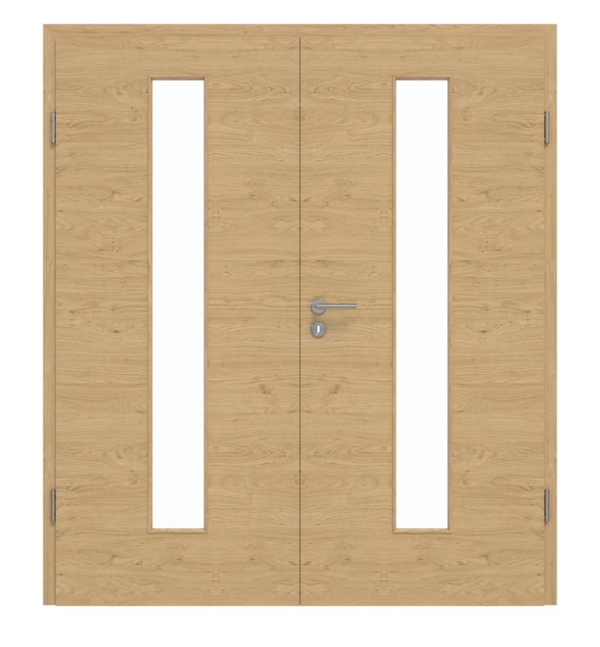 Środkowa część podwójnych drzwi wykonana jest z pełnej płyty wiórowej. Model ten może być stosowany zgodnie z grupą obciążenia M w pomieszczeniach prywatnych lub komercyjnych. Cena obejmuje oba skrzydła drzwiowe, odpowiednią ościeżnicę, zawiasy i zamek na klucz.