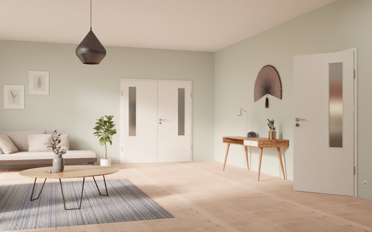 Krótkie, wąskie przeszklenia nadają drzwiom nowoczesny wygląd. Model charakteryzuje się łagodnym, naturalnym usłojeniem i białą barwą, które razem tworzą idealną harmonię. Powierzchnia HPL jest odporna na zabrudzenia, a jednocześnie odporna na zarysowania, ścieranie i uderzenia.
