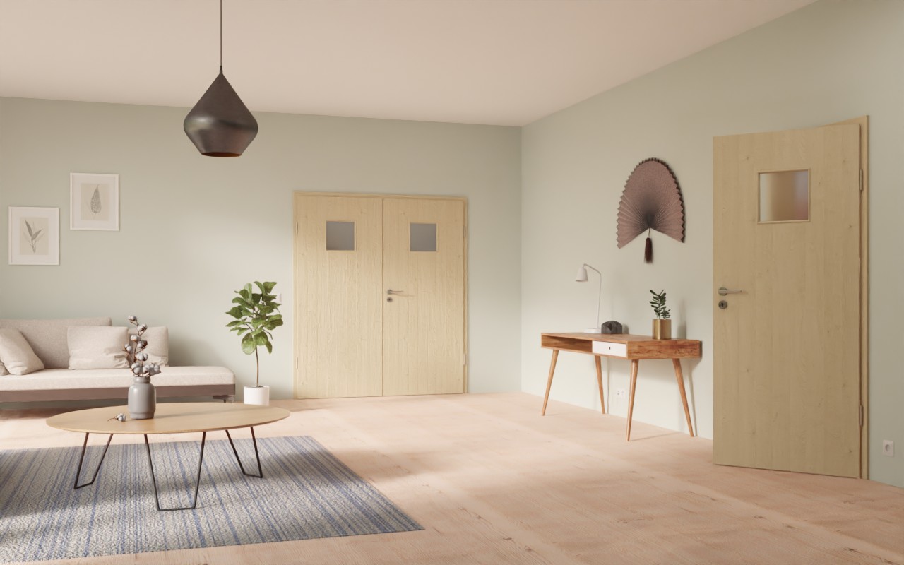 Elementem dekoracyjnym jest kwadratowe przeszklenie w górnej części drzwi. Jasny beż i subtelne ślady sęków nadają ton dekorowi Natura Klon . Oprócz atrakcyjnego wyglądu warstwa HPL przekonuje również swoją odpornością na zarysowania, uderzenia i ścieranie. Jest odporna na plamy i łatwa w czyszczeniu.