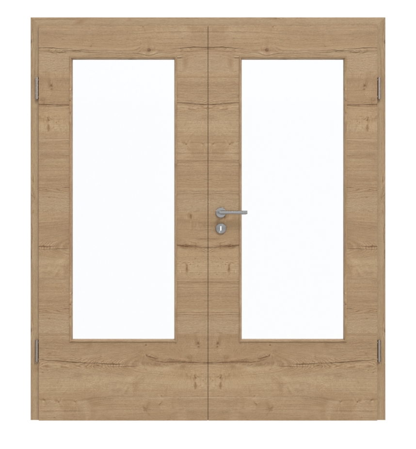 Rdzeń drzwi dwuskrzydłowych wykonany jest z płyty wiórowej. Produkt ten został przetestowany w klasie użytkowania M , dzięki czemu może być stosowany w pomieszczeniach prywatnych lub biurowych. Aby całość wyglądała estetycznie, drzwi dostarczane są wraz z ościeżnicą, zamkiem z kluczem oraz zawiasami.