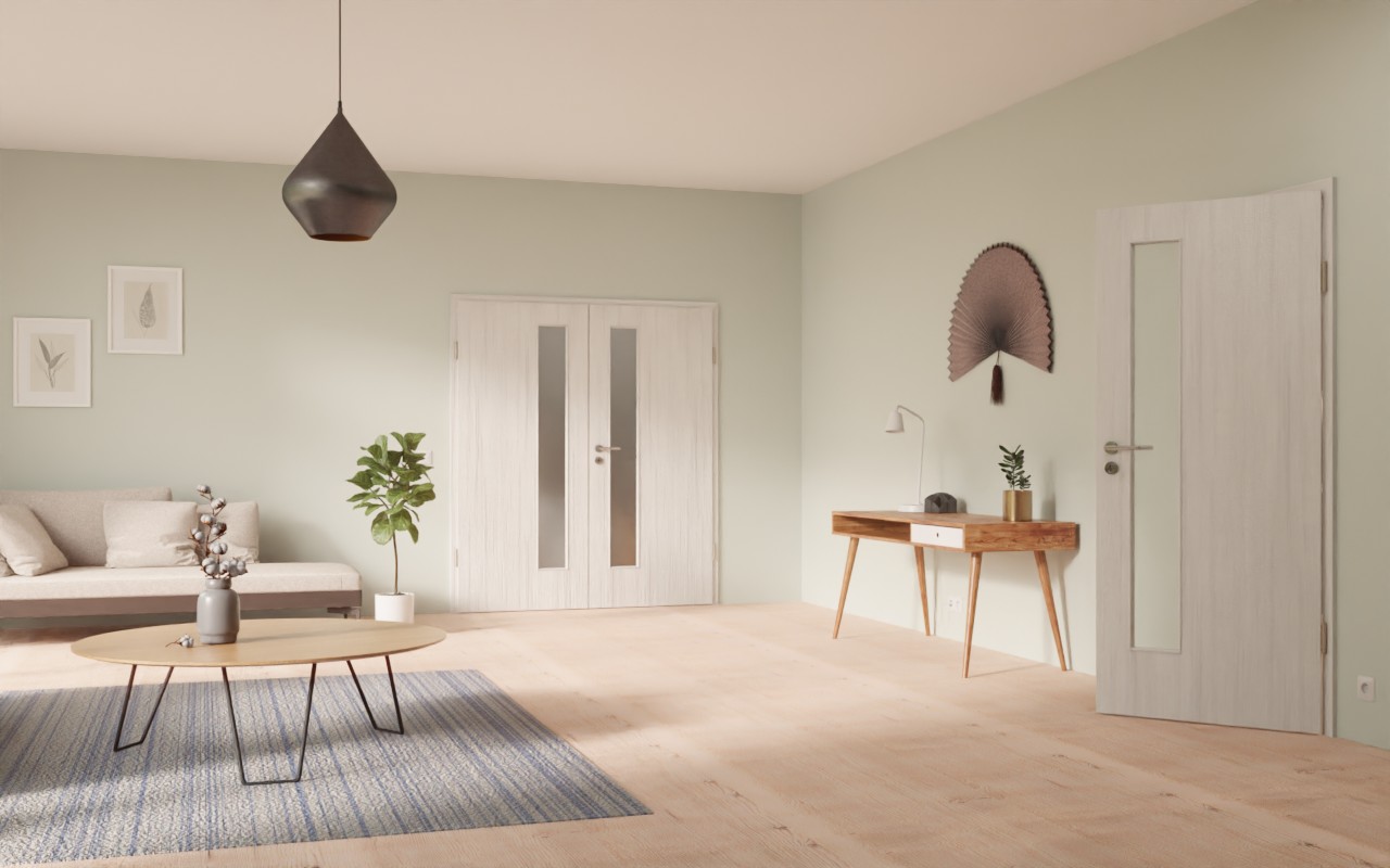 Na skrzydłach drzwi po stronie zamka znajduje się wąski przeszklenie. Wzdłuż modelu ciągnie się świeży odcień szarości z delikatnymi cieniowaniami. Zarysowania i uderzenia nie robią dużego wrażenia na solidnej powłoce HPL. Dodatkowo łatwo się ją czyści.