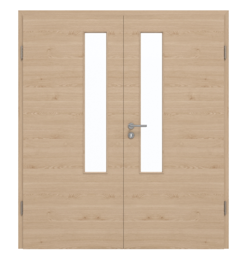 Drzwi dwuskrzydłowe, przetestowane w grupie obciążeniowej M , nadają się zarówno do pomieszczeń prywatnych, jak i biurowych. W rdzeniu wykonane z pełnej płyty wiórowej. W zestawie znajdują się skrzydło ruchome i skrzydło stałe, odpowiednia ościeżnica, zawiasy oraz zamek z kluczem.