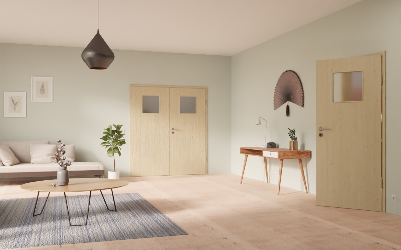 W górnej części drzwi znajduje się kwadratowe wycięcie na szybę. Delikatne linie słojów drewna autentycznie przeplatają się na jasnym dekorze Natura Klon. Łatwy w pielęgnacji laminat jest wyjątkowo odporny na uderzenia i zarysowania.