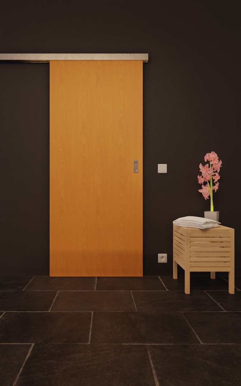 Codzienne uderzenia nie mają wpływu na skrzydło drzwiowe z rdzeniem z płyty wiórowo-otworowej. Podczas gdy prostokątny uchwyt wpuszczany muszlowy o owalnym chwycie idealnie dopełnia wygląd drzwi przesuwnych, rowek prowadzący podłogowy gwarantuje wygodną obsługę modelu.