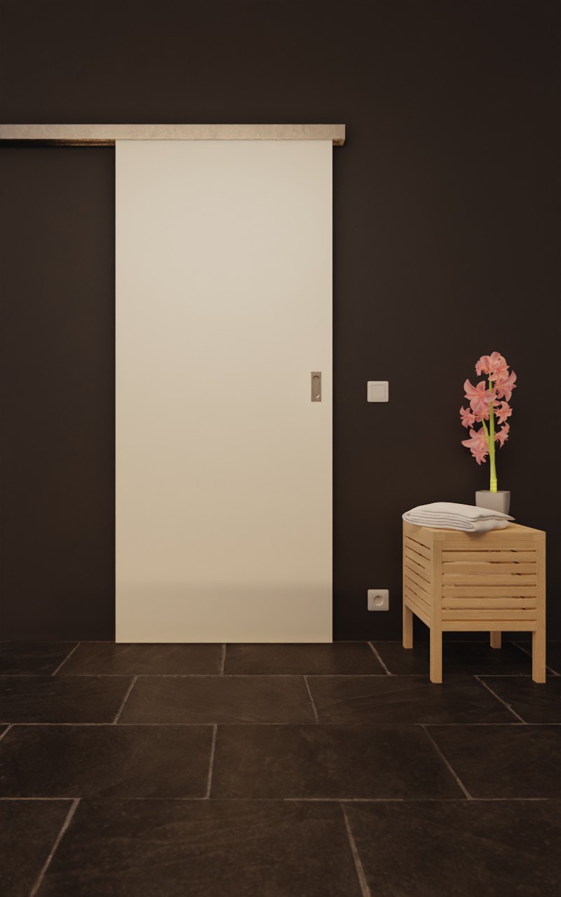Dzięki płycie wiórowej z rurkami w rdzeniu model ten niezawodnie wytrzymuje codzienne uderzenia. Podczas gdy rowek prowadzący w podłodze zapewnia płynne przesuwanie się skrzydła drzwiowego, kątowa muszla uchwytu z owalnym wgłębieniem gwarantuje harmonijny wygląd całości.