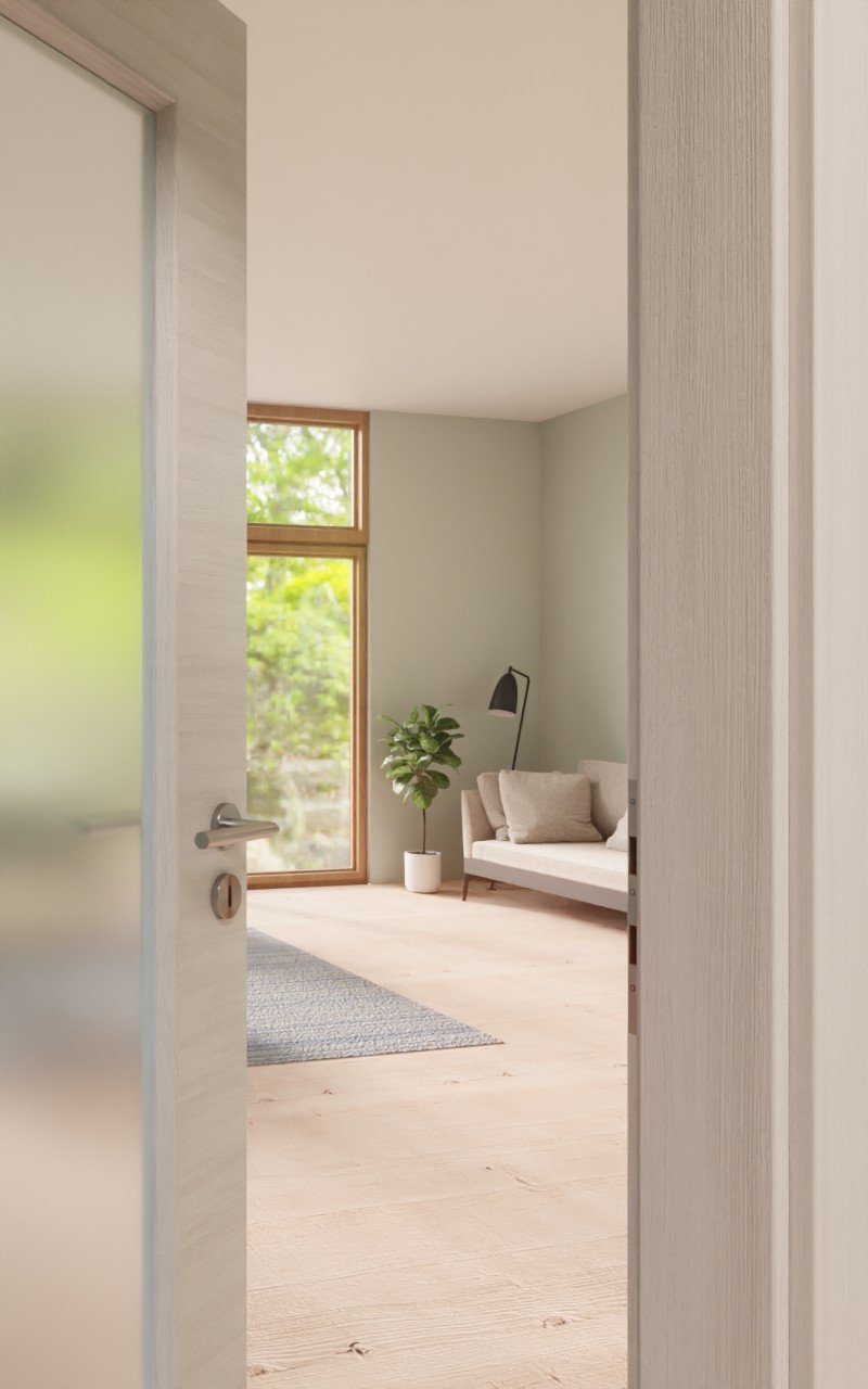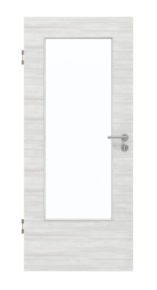 Delikatne linie przebiegają przez dekor, tworząc subtelny wzór drewna. Dzięki jasnoszaremu kolorowi powierzchnia harmonizuje zarówno z nowoczesnymi, jak i klasycznymi koncepcjami wnętrz. Duże, prostokątne przeszklenie wpuszcza dużo światła, co czyni je szczególnie korzystnym rozwiązaniem w ciemnych pomieszczeniach.