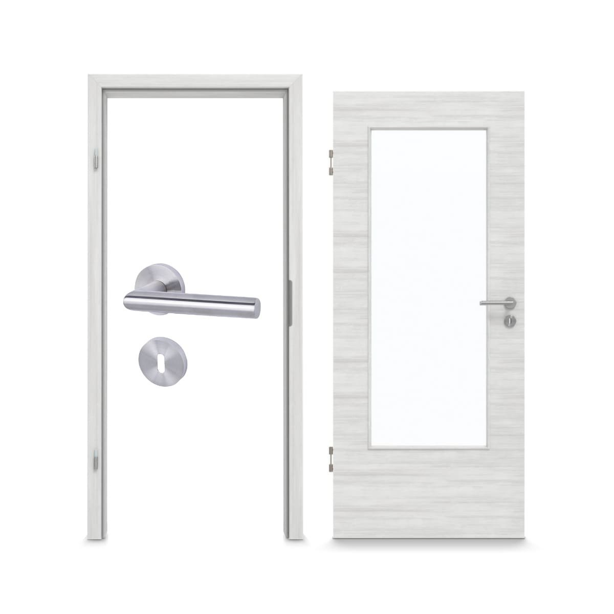 Praktyczny zestaw: Zestaw drzwi wewnętrznych LA-DIN od Garant zawiera zarówno skrzydło drzwiowe w kolorze Authentic Grigio Quer, jak i pasującą ościeżnicę oraz klamkę.