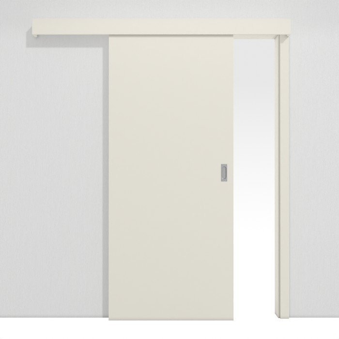 Zestaw obejmuje system montowany przed ścianą, skrzydło drzwiowe, prostokątny uchwyt wpuszczany muszlowy w kolorze stali szlachetnej z owalnym uchwytem oraz rowek prowadzący do podłoża. Wewnątrz drzwi znajduje się płyta wiórowa.