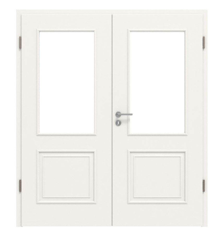 Dzięki listwom profilowym podwójne skrzydło drzwiowe zyskuje klasyczny wygląd. Wysokiej jakości białe lakierowanie w kolorze RAL 9010 lub RAL 9016 zapewnia wspaniały połysk. Dzięki przeszklonym otworom na wysokości oczu do wnętrza wpada dużo światła.