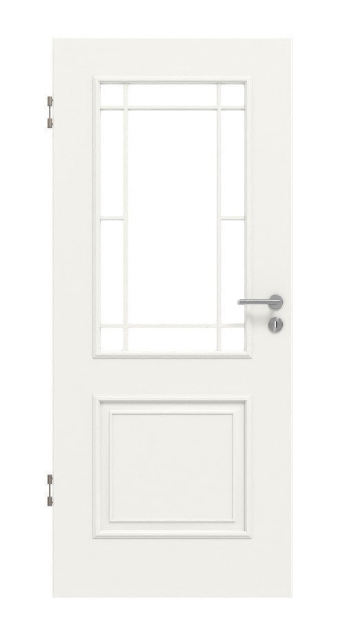 Dzięki szlachetnej warstwie lakieru do wyboru w kolorze RAL 9010 lub RAL 9016 skrzydło drzwi zyskuje niesamowity blask. Wycięcie na szybę wpuszcza dużo światła do wnętrza. Listwy profilowane nadają drzwiom klasyczny wygląd.