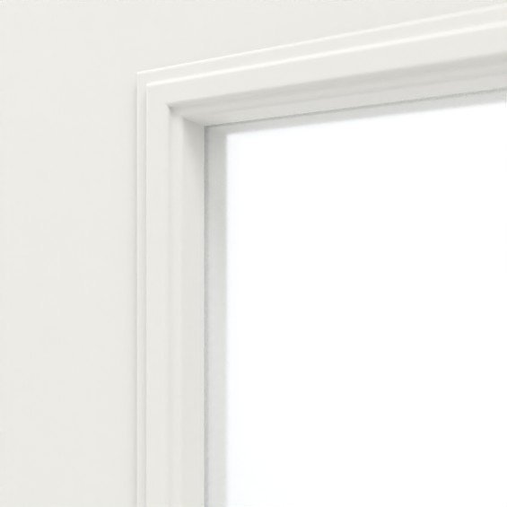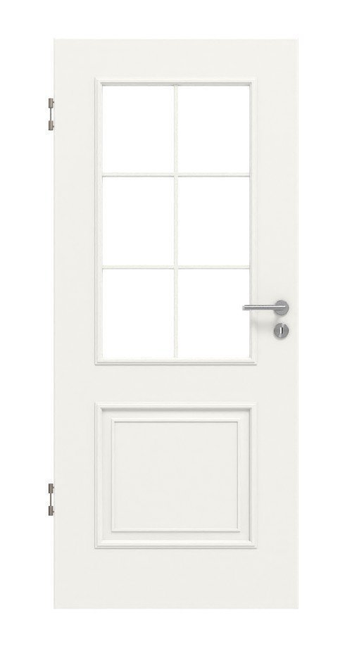 Białe lakierowane skrzydło drzwiowe, dostępne w kolorze RAL 9010 lub RAL 9016, dzięki listwom profilowym zyskuje klasyczny wygląd. Przeszklenie tworzy otwartą i przyjazną atmosferę.