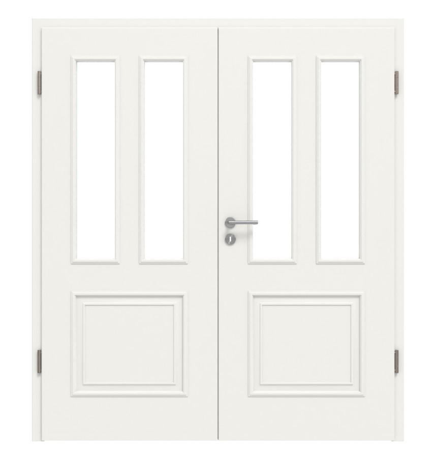 Na powierzchni każdego skrzydła drzwiowego widoczne są eleganckie listwy profilowe , które nadają modelowi dwuskrzydłowemu szlachetny wygląd. Powierzchnia zyskuje wspaniały połysk dzięki wysokiej jakości białej powłoce lakierowanej w kolorze RAL 9010 lub RAL 9016 do wyboru. Światło wpada do domu przez wąskie przeszklenie.