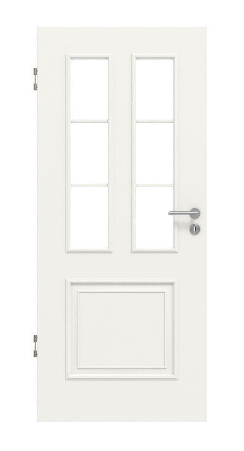 Wysokiej jakości białe lakierowanie w kolorze RAL 9010 lub RAL 9016 zapewnia wspaniały połysk. Model zyskuje klasyczny wygląd dzięki listwom profilowanym. Na wysokości oczu w skrzydle drzwiowym umieszczono dwa wąskie wycięcia na szybę.