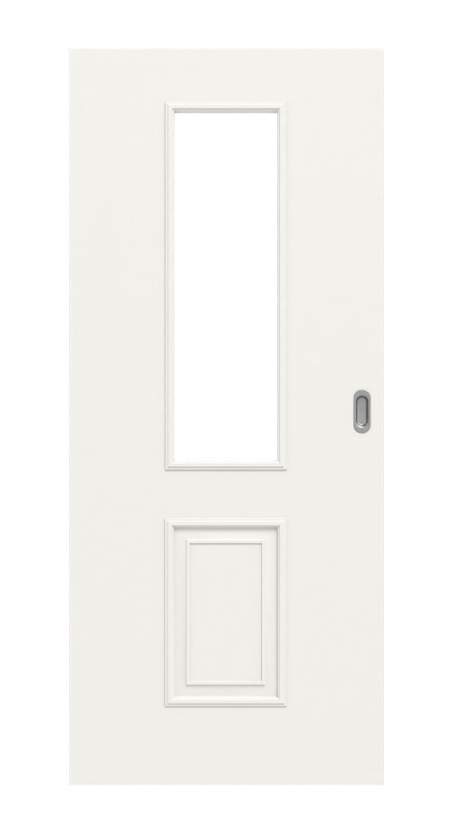 Stylowe listwy profilowane tworzą klasyczny wzór na skrzydle drzwiowym. Powierzchnia zyskuje nowoczesny i elegancki wygląd dzięki szlachetnemu białemu lakierowi w kolorze RAL 9010 lub RAL 9016 do wyboru. Wycięcie na szybę na wysokości oczu zapewnia jasne pomieszczenia.