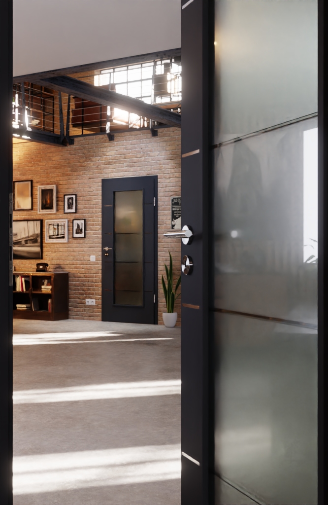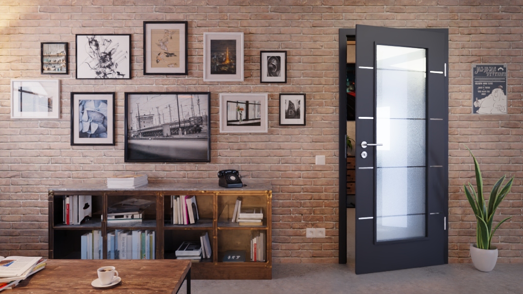 W drzwiach znajduje się wycięcie o szerokim ościeżu , które zapewnia doskonałe doświetlenie pomieszczenia. Połączenie między skrzydłem drzwiowym a przeszkleniem zapewniają cztery poziome pasy.